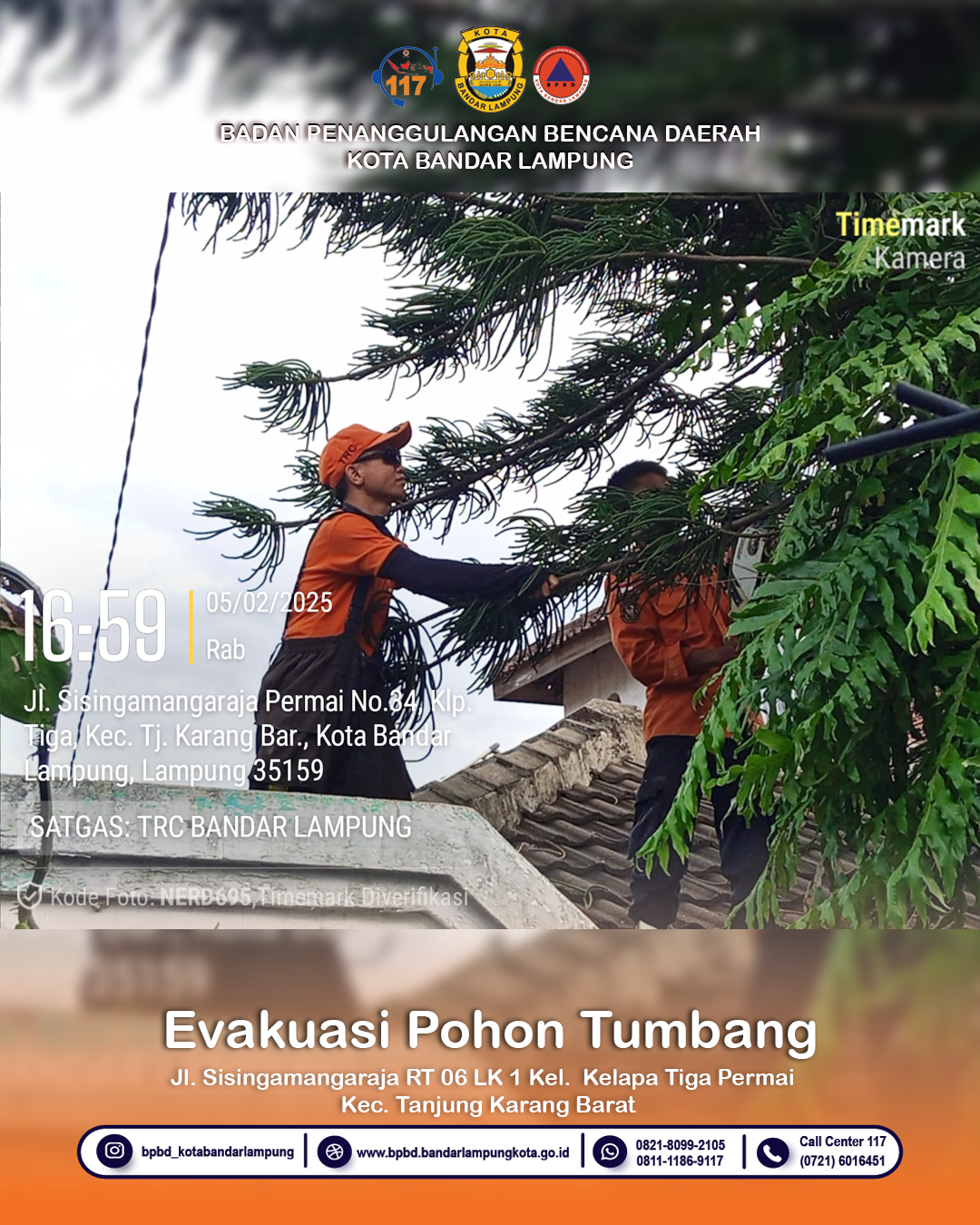Evakuasi dilakukan di Jl. Sisingamangaraja RT. 06 LK. I Kelurahan Kelapa Tiga Permai Kecamatan Tanjung Karang Barat Kota Bandar Lampung. Dampak Kejadian Menimpa Tembok Rumah Warga. Jenis Pohon Cemara Diameter ± 70 cm.