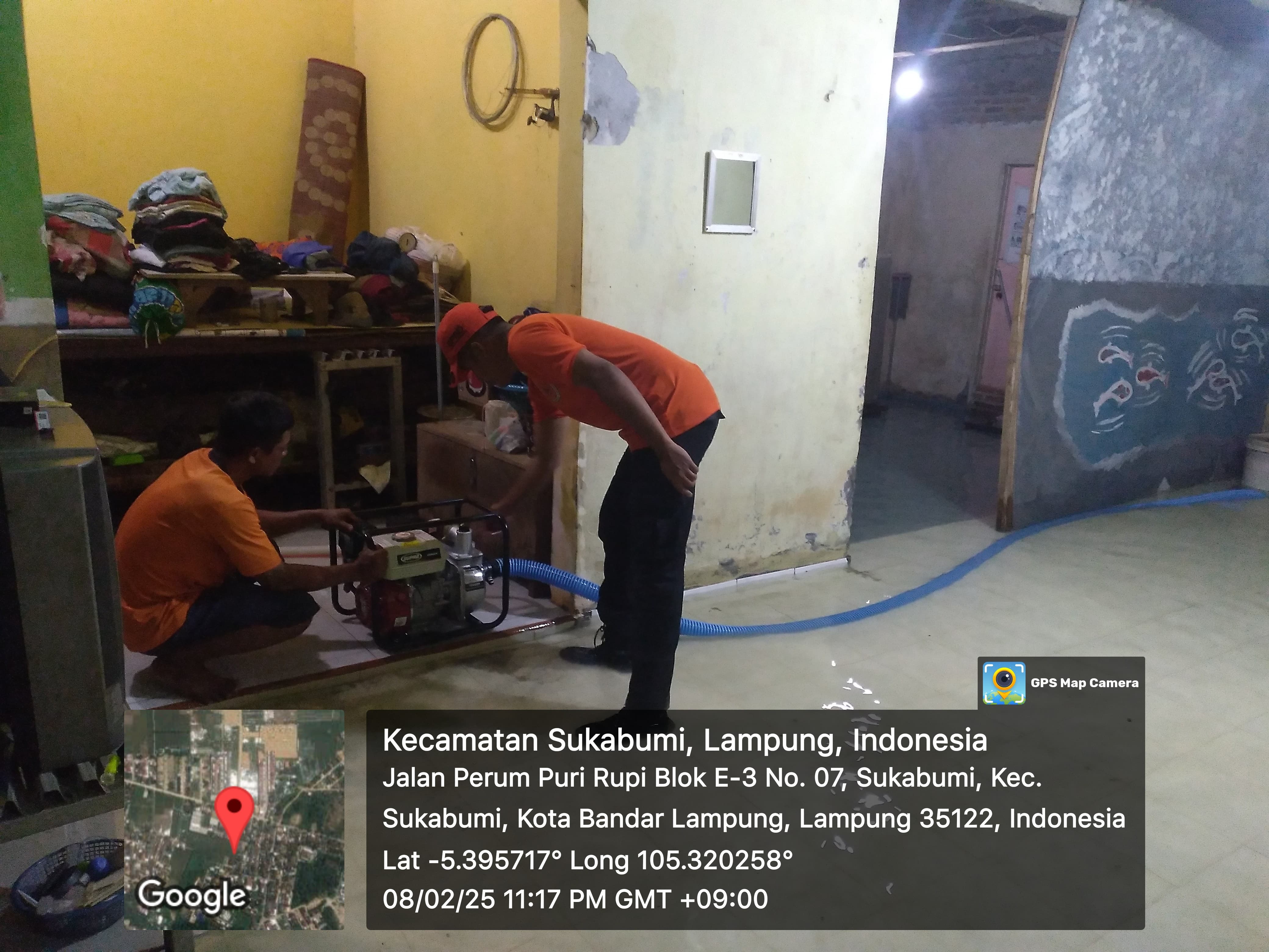Sabtu (08/02/2025) Pukul 19.10 - 21.13 WIB BPBD Kota Bandar Lampung melakukan Evakuasi Genangan Air dengan mengirimkan Tim Reaksi Cepat di wilayah Kota Bandar Lampung.